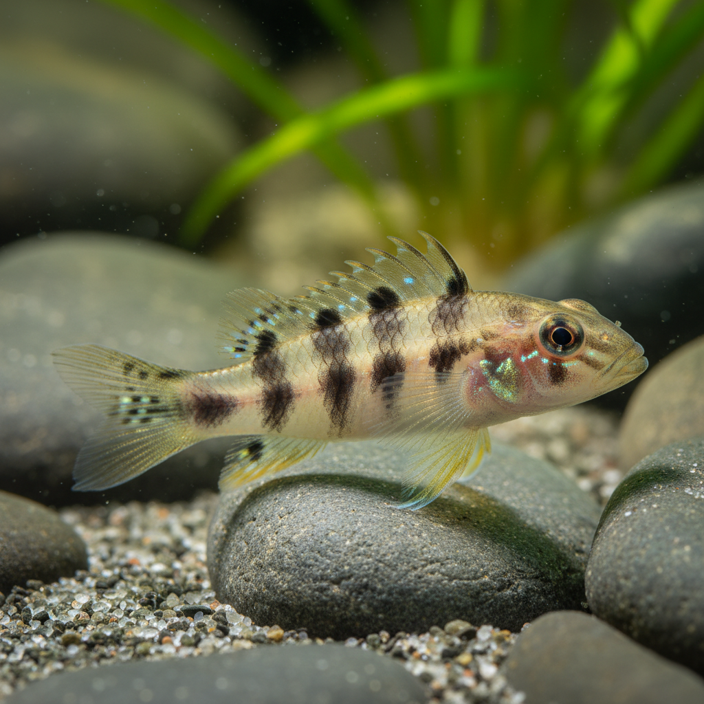 The Spotfin Goby Cichlid, scientifically known as Tanganicodus irsacae, is a captivating freshwater fish that hails from the serene waters of Lake Tanganyika in Africa. Renowned for its striking appearance, this cichlid features a vibrant blend of shimmering colors that set it apart in any aquarium. With its elongated body adorned with distinctive spots along its dorsal and caudal fins, it adds a unique visual appeal to aquascapes, making it a gem for enthusiasts and hobbyists alike. The contrast of its bright hues against a backdrop of natural decor or robust plant life enhances the overall aesthetics of the tank environment.