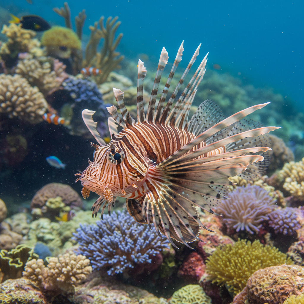 These lionfish are often found in depths ranging from 1 to 50 meters, favoring areas with abundant structure, where they can ambush passing prey. The clear waters not only provide optimal visibility for hunting but also allow for the growth of a diverse array of marine life, which plays a crucial role in the lionfish's diet. Their habitats are often characterized by complex ecosystems rich in corals and seaweeds, which offer both shelter and hunting grounds.