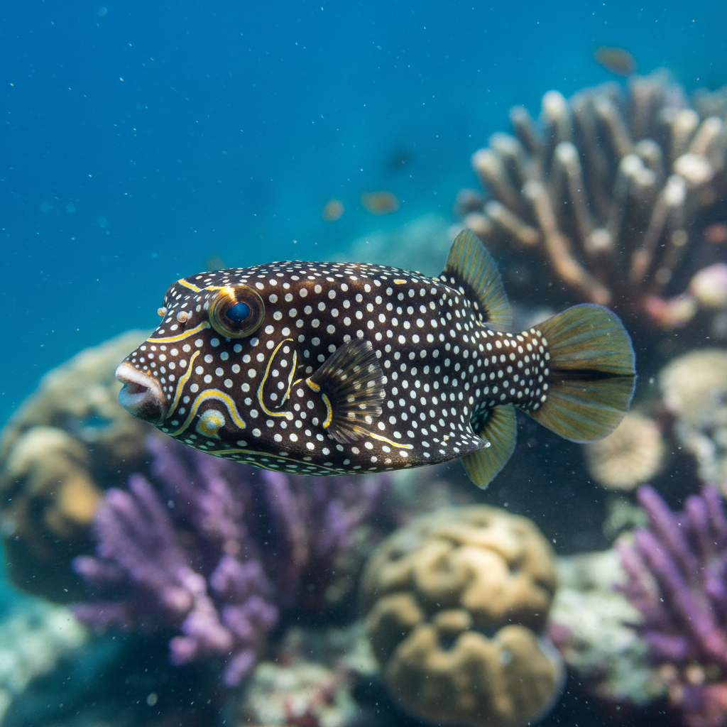 The Spotted Boxfish (Ostracion cubicus) is an intriguing marine species renowned for its unique, geometric shape and captivating coloration. Typically adorned with yellow and black patterns resembling a polka dot design, this fish has a box-like appearance that sets it apart from other aquaristic favorites. Its vibrant hues and distinctive form not only make it a visual masterpiece in home aquariums but also a conversation starter among enthusiasts. Additionally, the Spotted Boxfish symbolizes the exotic biodiversity of marine ecosystems, attracting hobbyists interested in biotope setups, which mirror their natural habitats.
