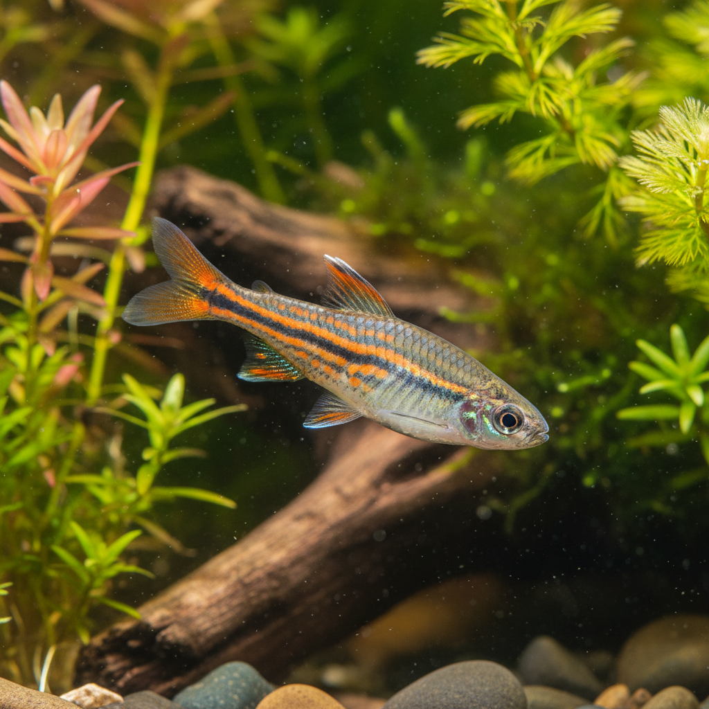 The Spotted Orange-finned Danio (Danio kyathit) is a captivating freshwater fish that has gained popularity among aquarists for its stunning appearance and lively nature. This small, vibrant species features an elongated body adorned with striking orange fins and distinct spots along its flanks, making it a visual delight in any aquarium setup. Averaging around 2 to 3 inches in length, the Spotted Orange-finned Danio exhibits an undeniable charm that appeals to both novice and experienced fishkeepers alike. Its unique coloration and active swimming behavior add a dynamic aesthetic to community tanks, providing visual vibrancy and entertainment.