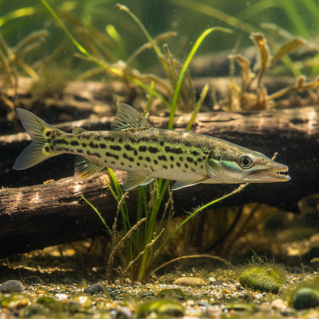 The Spotted Pike Characin is native to the slow-moving rivers and floodplains of the Amazon Basin, primarily found in countries like Brazil, Colombia, and Peru. This species thrives in blackwater environments, which are often characterized by stained, tea-colored waters rich in organic materials such as leaves and sediment. These biotopes provide the Spotted Pike Characin with essential cover and hunting grounds, as the dark waters are interspersed with sunlit shallows that attract small fish and other prey. Natural vegetation, which may include floating plants and submerged logs, plays a pivotal role in its habitat by offering shelter and breeding sites.