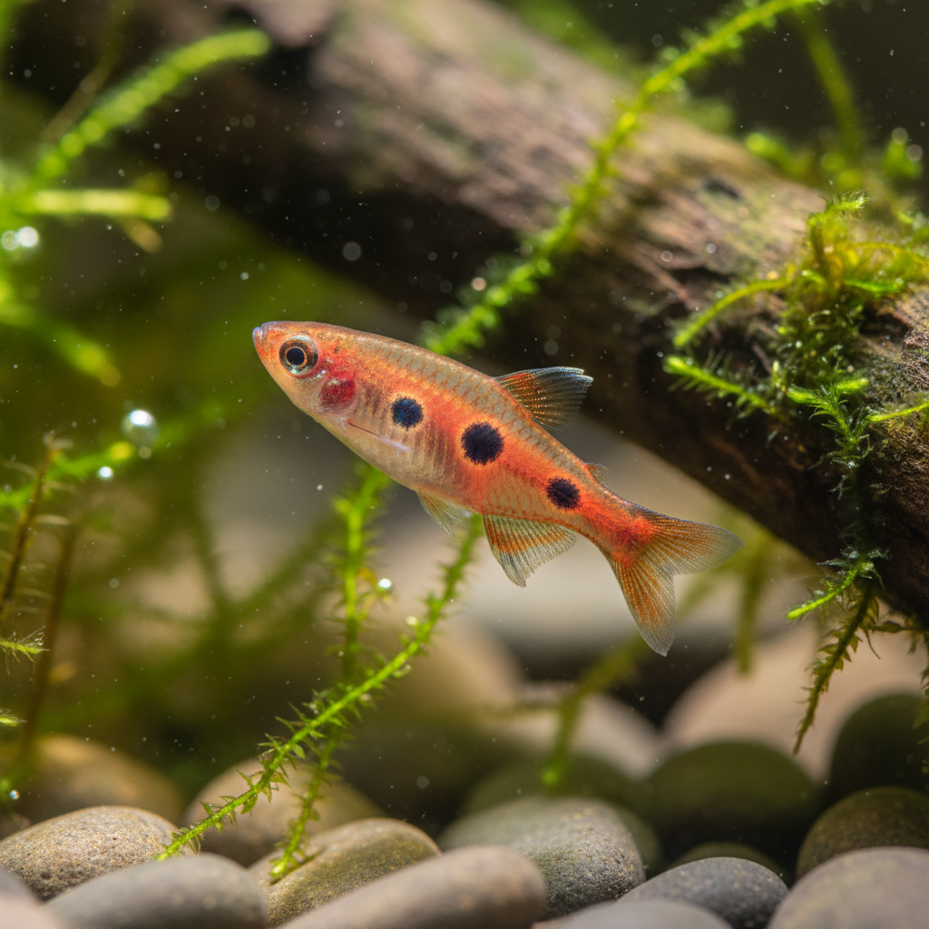 A spectacularly tiny, deeply red-hued micro-fish completely characterized by three stark black spots and hyper-peaceful behavior.