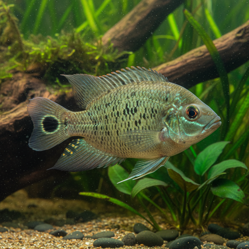 This species inhabits blackwater rivers, where tea-colored waters rich in tannins typify its natural environment. The stained waters provide ample cover and reduce light penetration, a factor that influences the Spotted Severum's coloration. The leaf litter and organic materials present in its habitat also create a nutrient-rich substrate, which plays a crucial role in fostering its natural behavior and health.