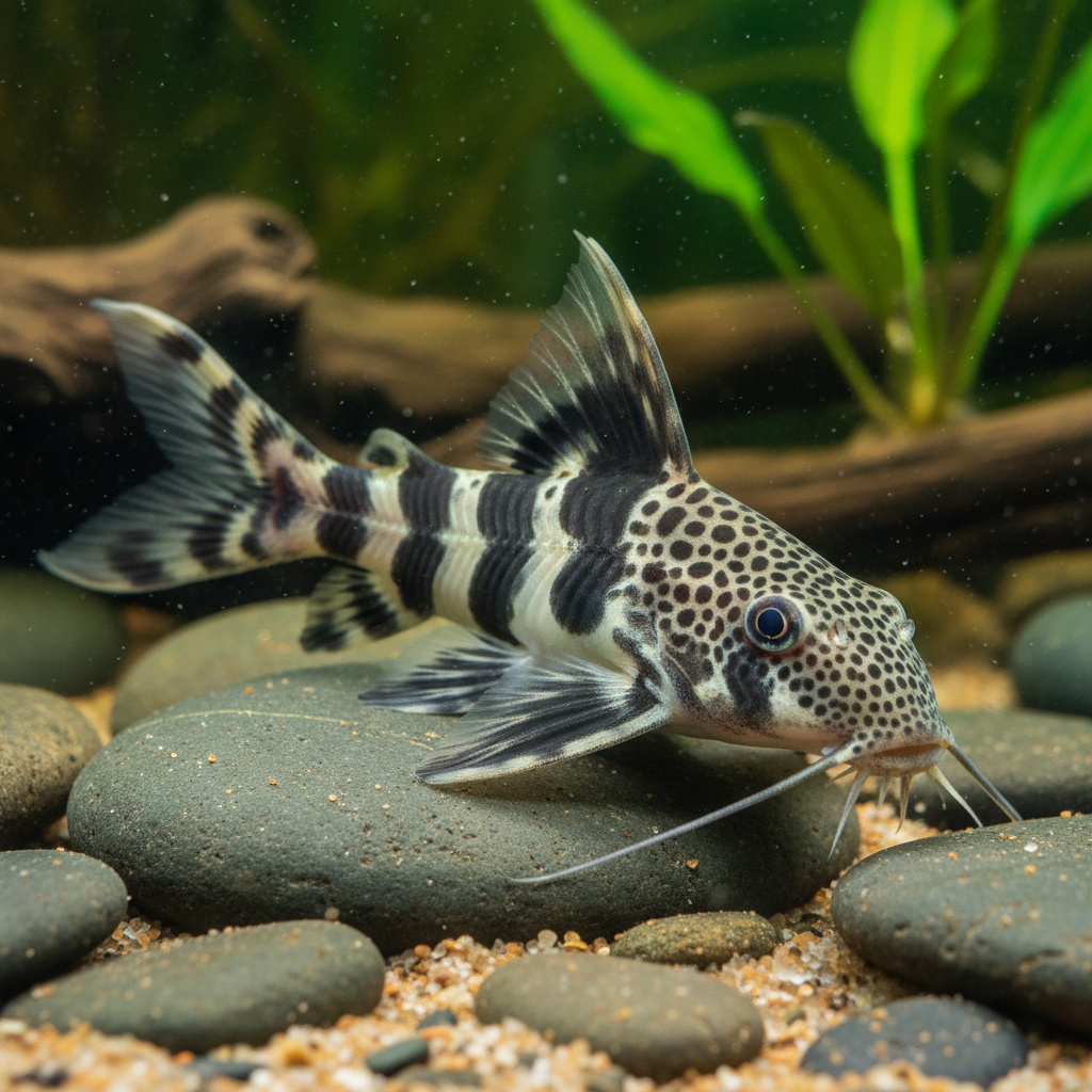 The Spotted Talking Catfish, scientifically known as Agamyxis pectinifrons, is a captivating freshwater fish that has gained popularity among aquarium enthusiasts. Distinguished by its unique appearance, this catfish features a striking pattern of dark brown and black spots against a lighter body, usually beige or creamy white. Its large, expressive eyes and elongated body shape further enhance its visual appeal, making it a standout addition to any aquascape. The Spotted Talking Catfish is not only prized for its aesthetic qualities, but also for its fascinating behavior; it is known to produce various sounds, including grunts and clicks, that contribute to its nickname "talking catfish."