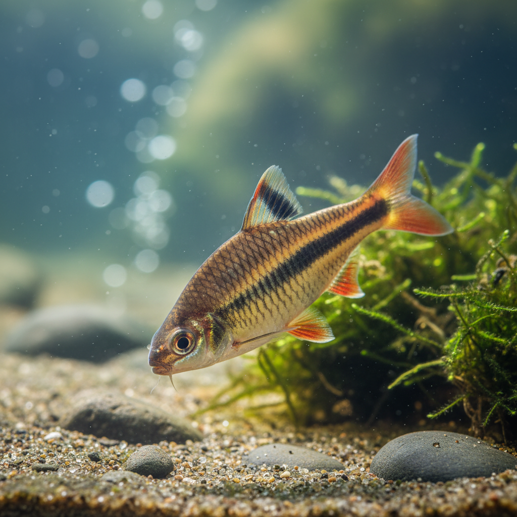 The Striped Barb is primarily indigenous to the freshwater streams and rivers of Southeast Asia, specifically found in countries like Indonesia, Malaysia, and Thailand. These waters are typically characterized by their clear, flowing nature, with temperatures that fluctuate between 24°C to 28°C (75°F to 82°F). Striped Barbs typically inhabit areas with a moderate flow, where the substrate consists of fine sand and gravel, interspersed with plenty of vegetation, which provides cover and breeding sites. Unlike many other species that prefer heavily shaded environments, the Striped Barb is often found in well-lit areas, showcasing their beautiful coloration against the natural backdrop.