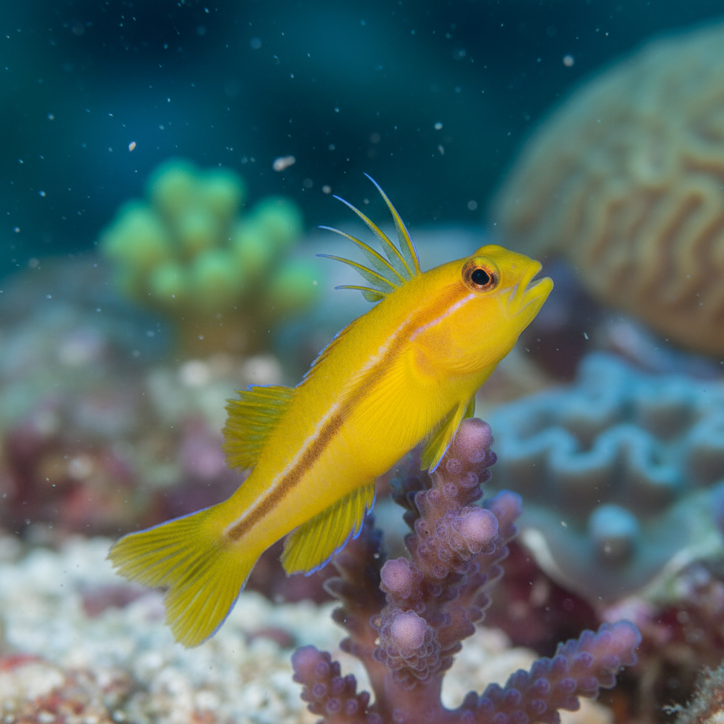 The Sulphur Goby hails from the shallow, warm waters of the Indo-Pacific region, including the Coral Triangle and parts of the Great Barrier Reef. It thrives in environments rich with coral reefs, where it can be found among rocky crevices and sandy substrates. Typically residing in clear water, the Sulphur Goby prefers locations where it can hide from larger predators while actively foraging for food. This fish is often found at depths ranging from one to six meters, where light penetrates and supports a vibrant community of flora and fauna.