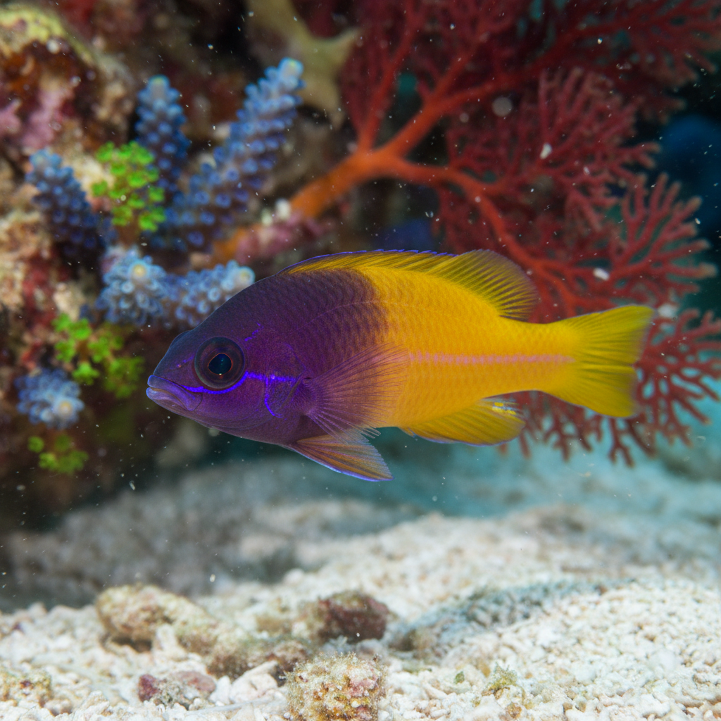 The Sunrise Dottyback is native to the coral reefs of the Indian and Pacific Oceans, specifically in areas around the Maldives, Indonesia, and Papua New Guinea. This species typically inhabits shallow waters where they can find refuge among rocky crevices and coral formations. The natural environment consists mainly of clear tropical waters, allowing these fish to exhibit their vivid colors proudly among the vibrant corals. Such habitats often boast a rich biodiversity, making the Sunrise Dottyback an integral part of the reef ecosystem, where it contributes to the dynamic ecological balance.