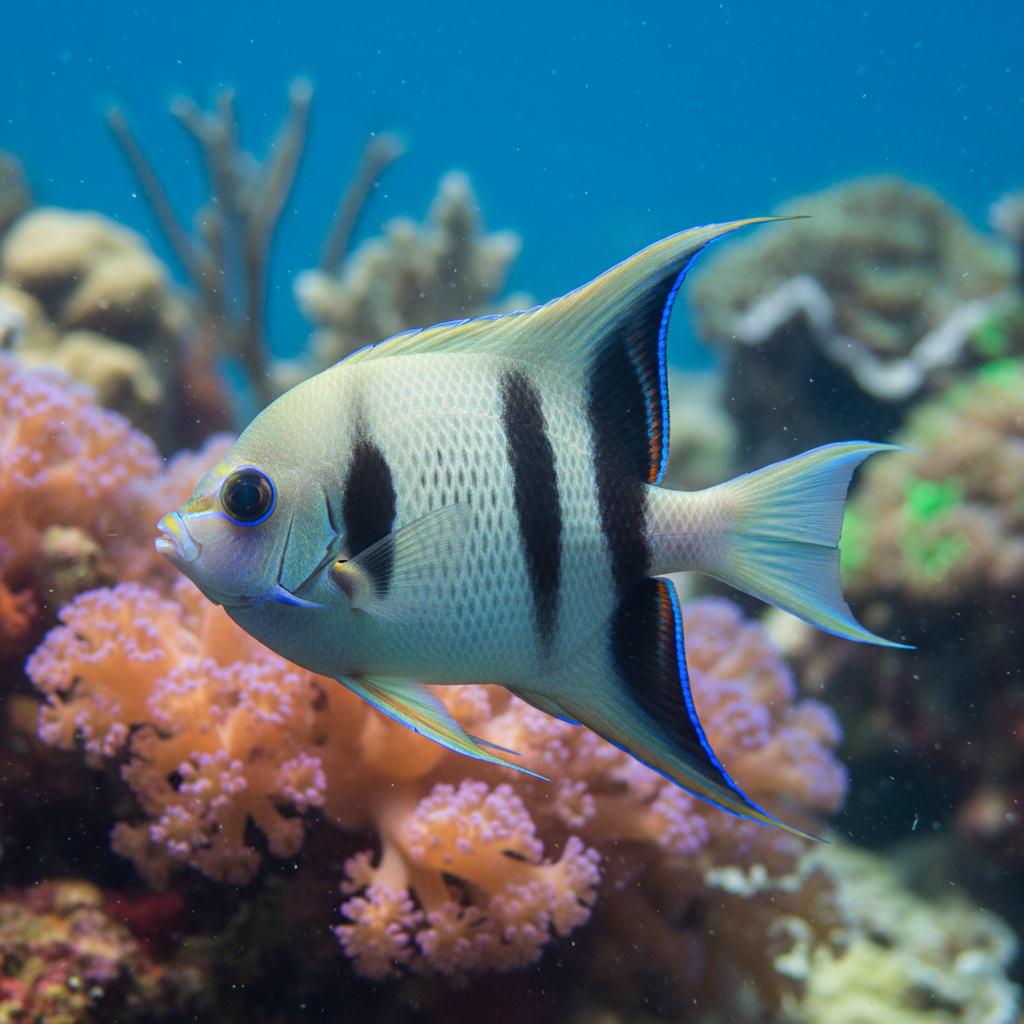 The Swallowtail Angelfish (genus Centropyge) is a captivating species known for its vibrant coloration and unique tail shape. Found primarily in the warmer waters of the Indo-Pacific region, this fish showcases a stunning array of colors, including shades of blue, yellow, and orange, which make it a prized addition to marine aquariums. Its body features a characteristic swallowtail shape that enhances its visual appeal, allowing it to swim gracefully through the water. The Swallowtail Angelfish is particularly significant in the aquarium hobby due to its hardiness and relatively peaceful temperament compared to other angelfish species, making it a great choice for both novice and experienced aquarists.