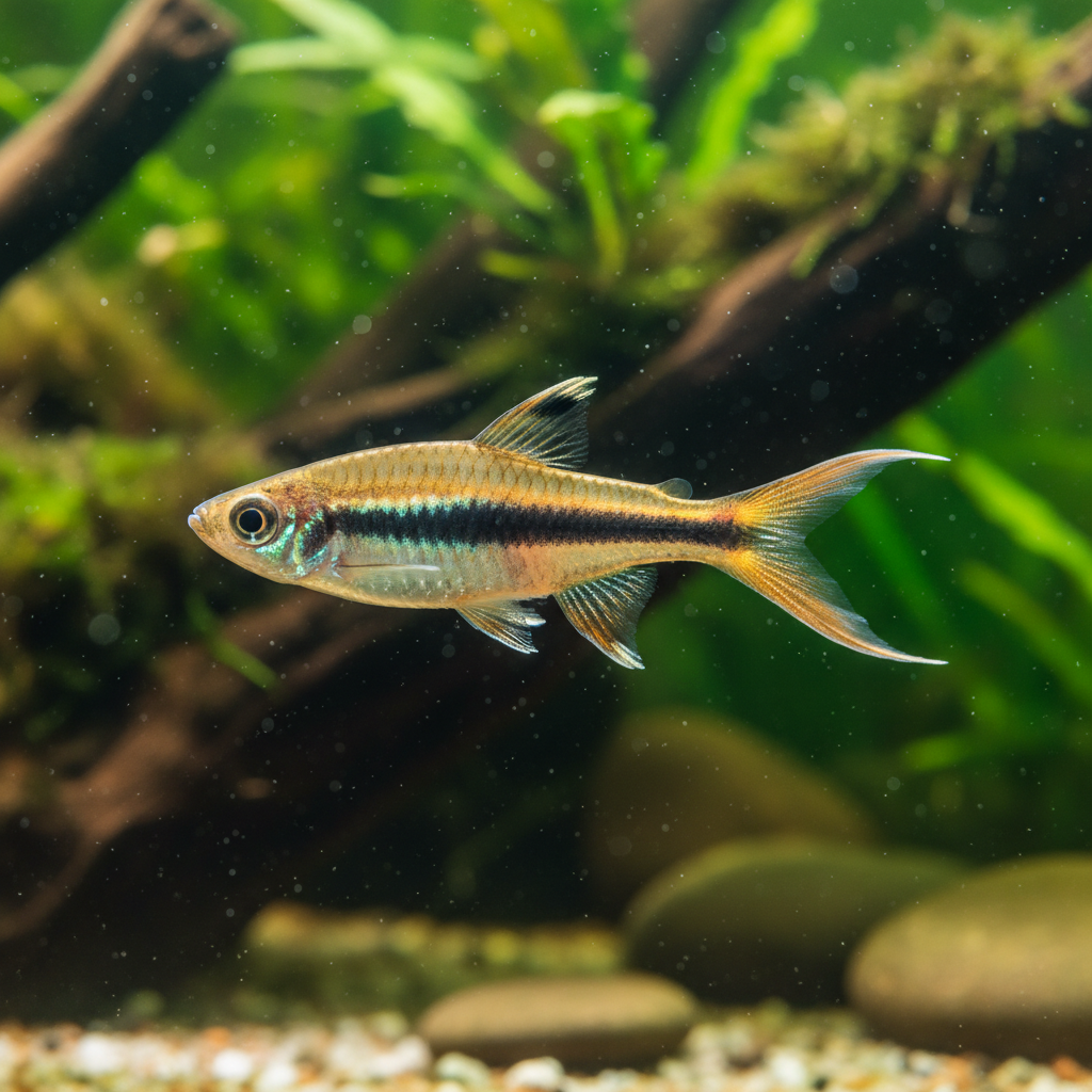 The Swordtail Characin hails from the slow-moving waters of the Amazon River and its tributaries, where it inhabits shallow areas rich in vegetation. These waters are typically classified as blackwater systems, characterized by high concentrations of dissolved organic matter, which gives the water a dark coloration. The environment is often warm, humid, and filled with submerged roots, decaying leaves, and dense aquatic flora. Such habitats create an intricate system of natural biofiltration, which is essential for the health of the Swordtail Characin, as well as other species inhabiting these waters.