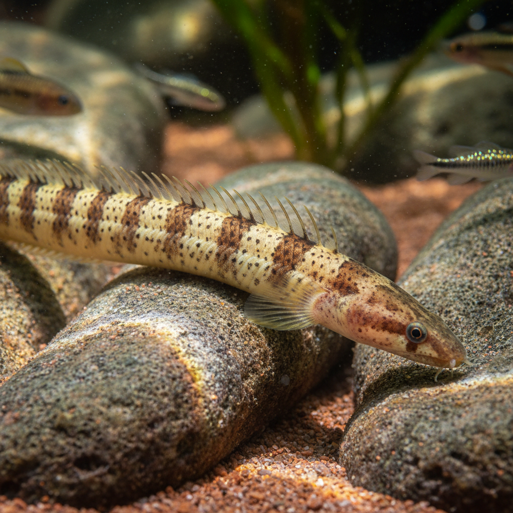 The Tanganyikan Spiny Eel is endemic to Lake Tanganyika, one of Africa’s Great Lakes, which is famous for its extensive biodiversity and unique geological characteristics. This lake features a mixture of deep, clear waters and diverse microhabitats such as rocky substrates, sandy bottoms, and submerged vegetation. In its natural habitat, the Tanganyikan Spiny Eel tends to be found in shallow waters, often near the substrate, where it prefers to burrow and seek shelter among rocks and plant roots. The water in Lake Tanganyika is typically alkaline, with pH levels ranging from 8.0 to 9.0, making it essential for hobbyists to mirror these conditions to meet the fish's needs.