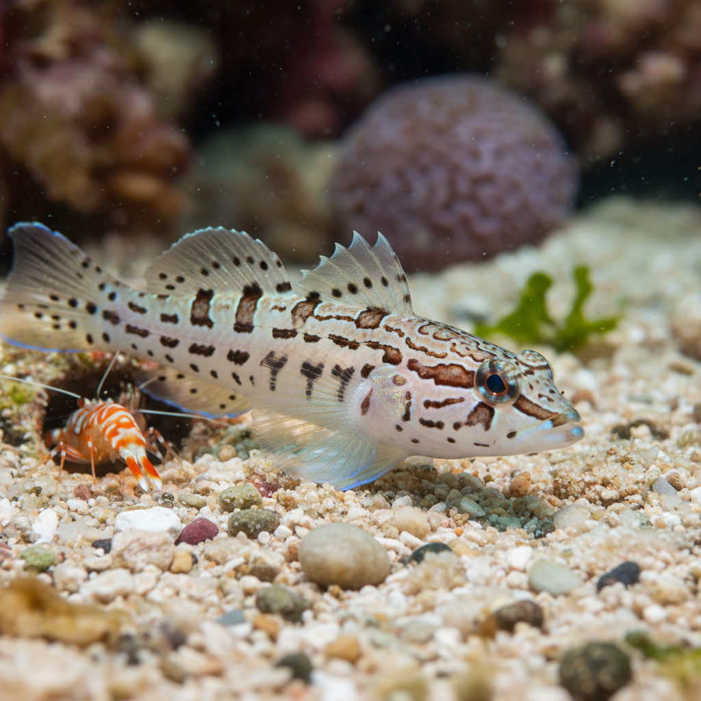 The Tangaroa Shrimp Goby is native to the coral reefs of the Indo-Pacific region, specifically found around locales like the coral gardens of Fiji, French Polynesia, and the Great Barrier Reef. It typically inhabits shallow waters, preferring sand and rubble substrates that offer ample burrowing opportunities. This species thrives in clear waters with good visibility, which is crucial for its survival as a predator and its reliance on visual cues for communication with its shrimp partners.