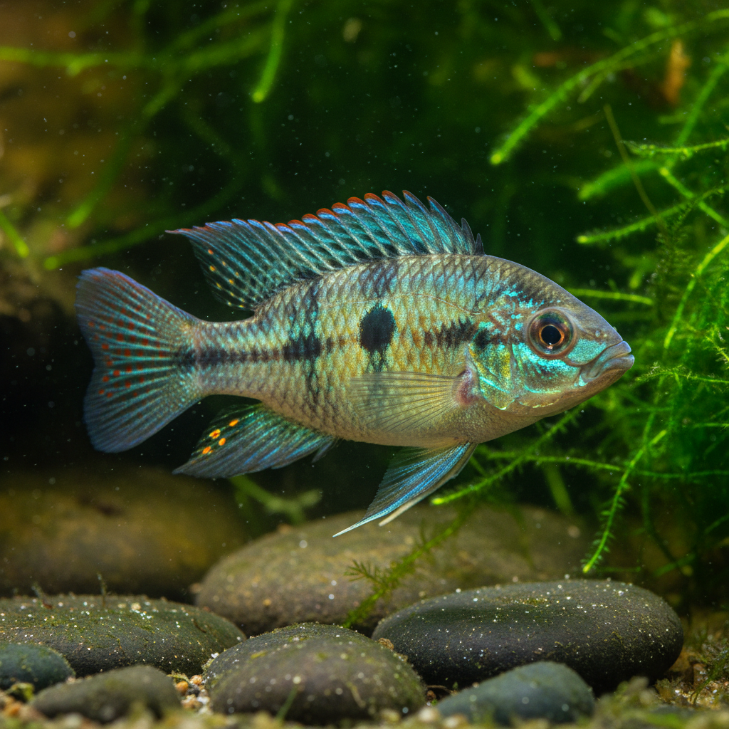 Thayer's Dwarf Acara, known scientifically as Laetacara thayeri, is a remarkable small cichlid that enchants aquarists with its striking coloring and unique behaviors. Native to freshwater rivers and streams, this species exhibits a tapestry-like pattern of vibrant blues, greens, and subtle yellows, making it an attractive addition to community aquariums. One of the standout features of Thayer's Dwarf Acara is its peaceful demeanor, which distinguishes it from many other cichlid species notorious for their territoriality. As a result, this fish has earned a reputable place in the aquarium hobby, appealing to both novice and advanced aquarists alike.