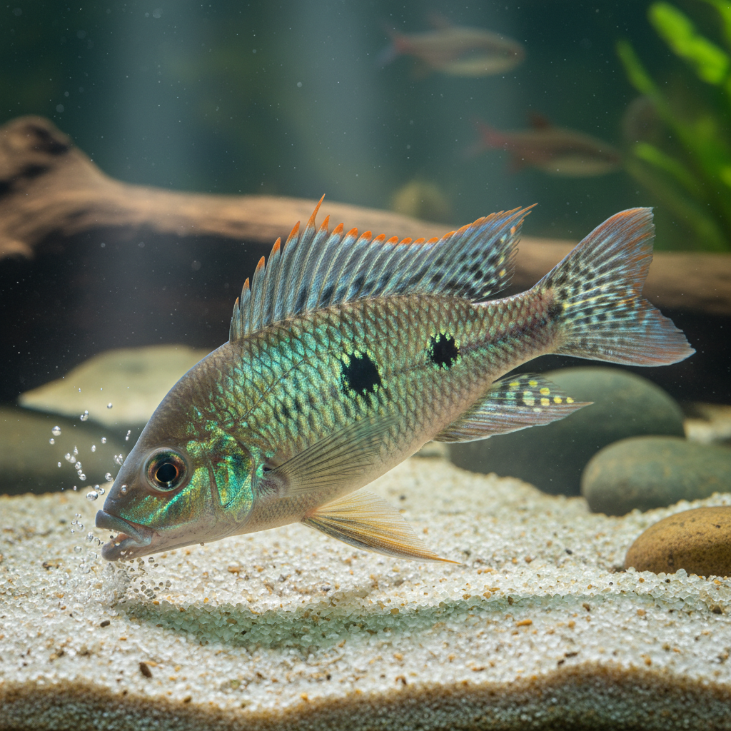 The Threespot Eartheater exhibits a generally peaceful demeanor but can show territorial behavior, especially during breeding periods or in smaller tanks. They are not true schooling fish; rather, they prefer to establish territories where they can sift through the substrate without interference. When kept in appropriate group sizes, they can coexist peacefully with similar-sized fish. Their behavior is often characterized by a curiosity and intelligence that makes them enjoyable to observe, particularly during feeding times.