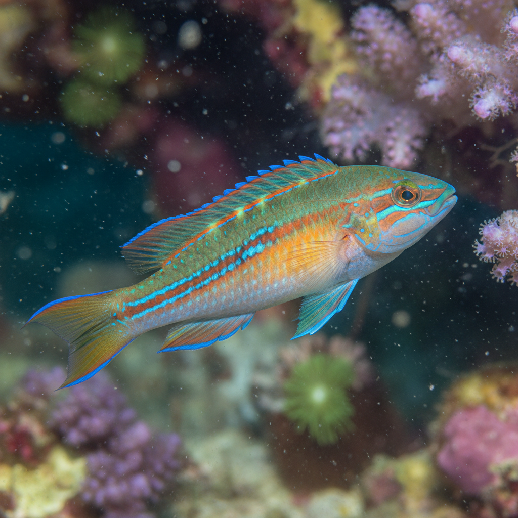 The Timor Wrasse, scientifically known as Cirrhilabrus reticulatus, is a stunning species that hails from the vibrant coral reefs of the Indo-Pacific region. Known for its vivid coloration and striking patterns, the Timor Wrasse captivates aquarium enthusiasts with its blend of sapphire blues, bright yellows, and iridescent greens. This small, streamlined fish typically reaches about 4-5 inches in length, making it an appealing choice for both novice and experienced aquarists alike. Its visual allure is not just a feast for the eyes; the Timor Wrasse also plays a vital ecological role, helping to maintain the health of coral reef ecosystems by feeding on small invertebrates and algae.