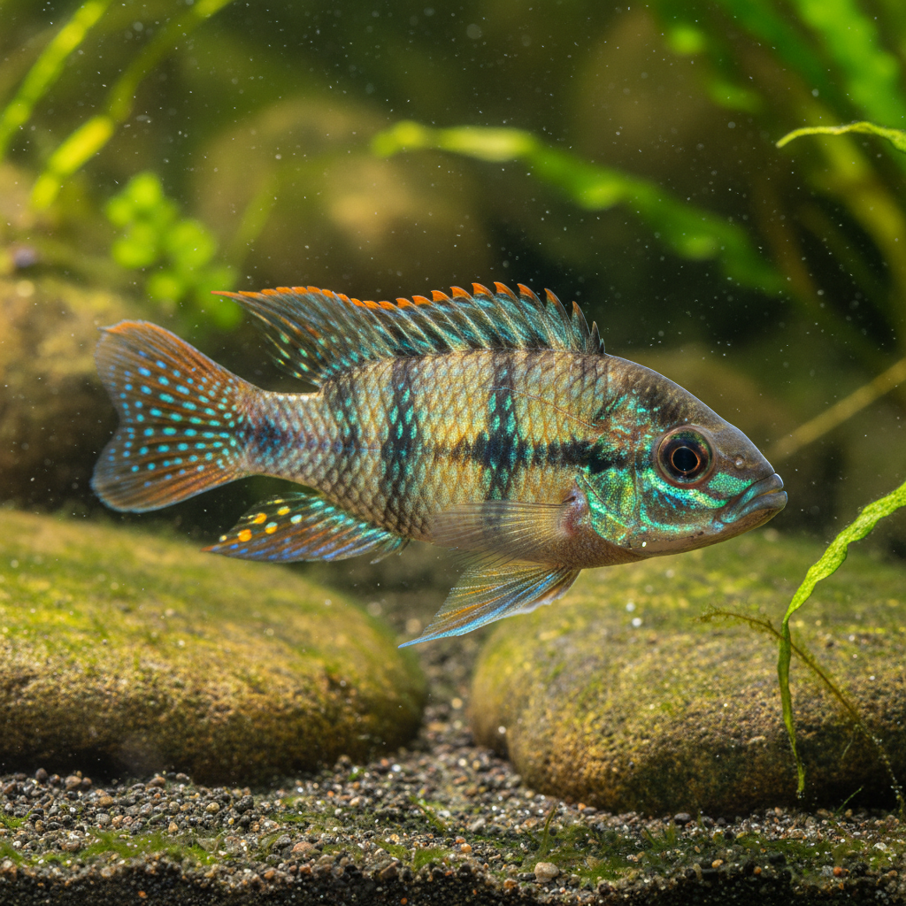When setting up a tank for the Transvestite Dwarf Cichlid, a minimum volume of 20 gallons is recommended, although larger tanks can provide a more stable environment and space for territorial behaviors. The substrate should consist of fine sand to replicate their natural habitat, providing a soft area for them to dig and forage. Incorporating smooth stones, driftwood, and dense vegetation will not only add aesthetic value but also offer hiding places crucial for their comfort and security.