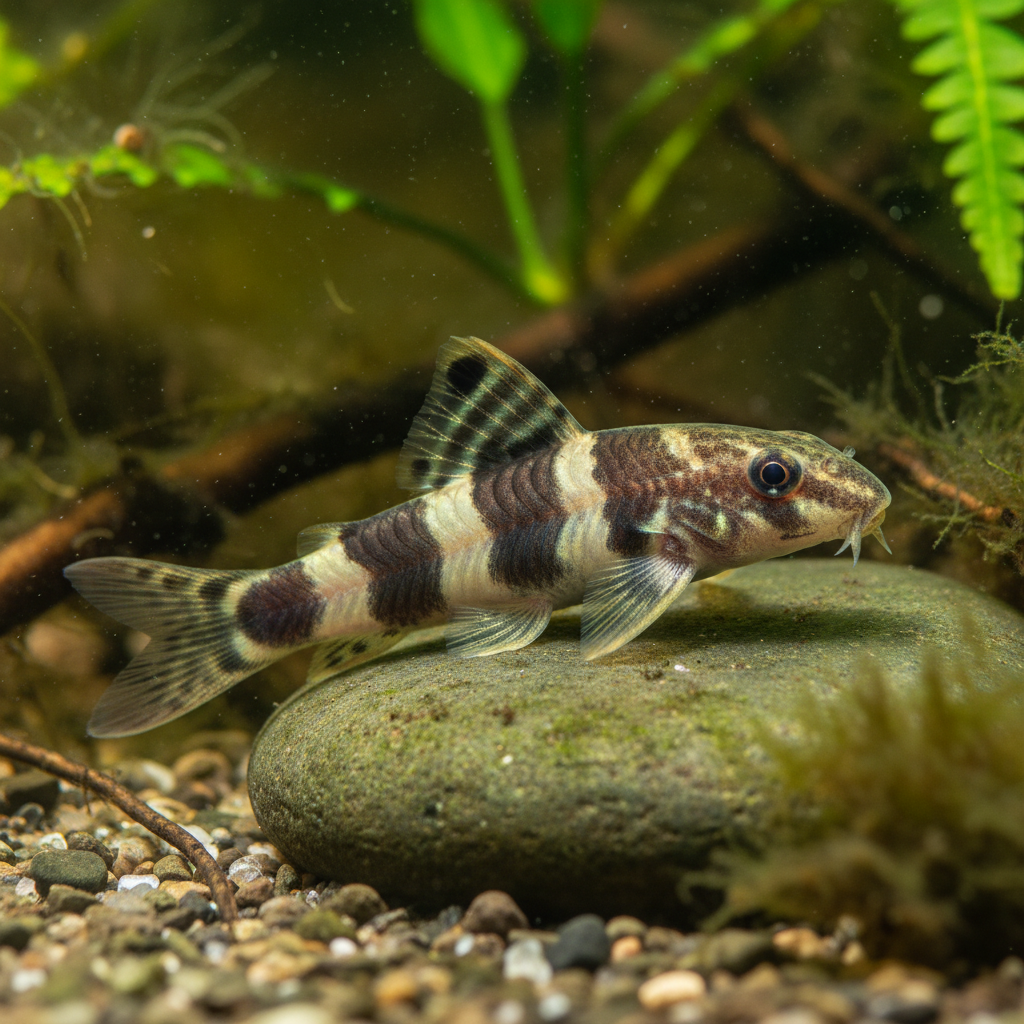 The Tri-Band Sumo Loach is native to the freshwater rivers and streams of Southeast Asia, specifically found in parts of Bhutan, Bangladesh, and North India. These regions are characterized by their diverse aquatic environments, where the loach inhabits clear, fast-flowing waters rich in vegetation and organic debris. The natural habitat often consists of rocky substrates, which provide ample hiding spaces for these fish to explore and seek refuge from potential predators.