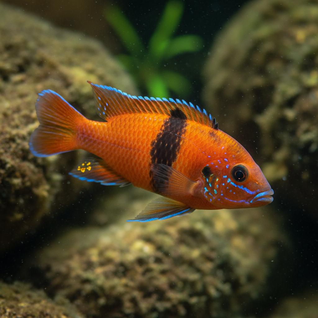 For substrate, fine to medium gravel is preferable as it mimics the rocky bottom of their native lake. A well-structured tank with plenty of hiding spots, such as rocks and caves, allows these fish to feel secure and exhibit natural behaviors. While lighting should be moderate to bright to promote plant growth, live plants aren't strictly necessary; instead, incorporating artificial decorations can also offer shelter. It is essential to ensure good filtration to maintain water quality, as these fish can be sensitive to changes in their environment.