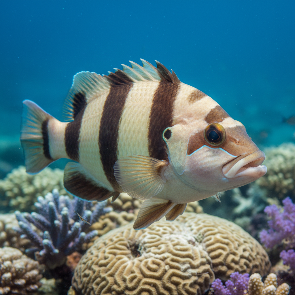 The Twobanded Soapfish (Diploprion bifasciatum) is a stunning saltwater fish known for its unique appearance and behavior.