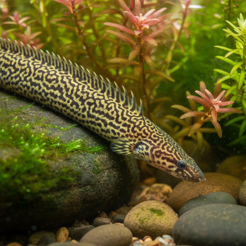 A beautifully patterned giant spiny eel. Intelligent and distinctively marked with zigzag patterns resembling tire tracks.