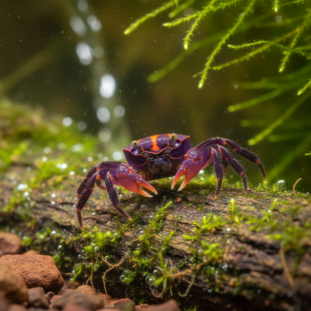 The Vampire Crab, scientifically known as Geosesarma spp., is a captivating freshwater crab that has surged in popularity within the aquarium hobby due to its striking appearance and fascinating behaviors. These crabs are easily identifiable by their vibrant coloration, typically featuring bright shades of red, orange, and blue accentuated by distinct black markings, reminiscent of their namesake. Their unique visual appeal, coupled with their intriguing behavior, makes them a sought-after addition to aquariums, where they can be appreciated not just for their looks but also for their active lifestyles. As creatures of the land and water, they exhibit charm through their terrestrial and aquatic antics, enriching the overall dynamic of any community tank.