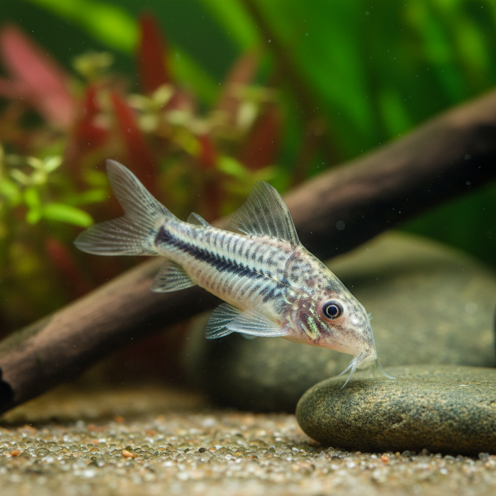 A charming and active dwarf corydoras known for its distinctive spotting and short snout, making it a perfect bottom dweller for small community tanks.