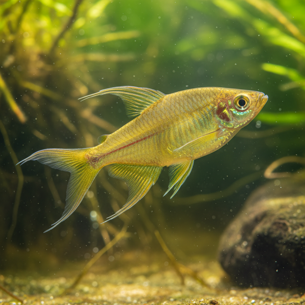 A glowing and elegant tetra from the Congo River basin, featuring a subtle yellow iridescence and long, graceful fins.