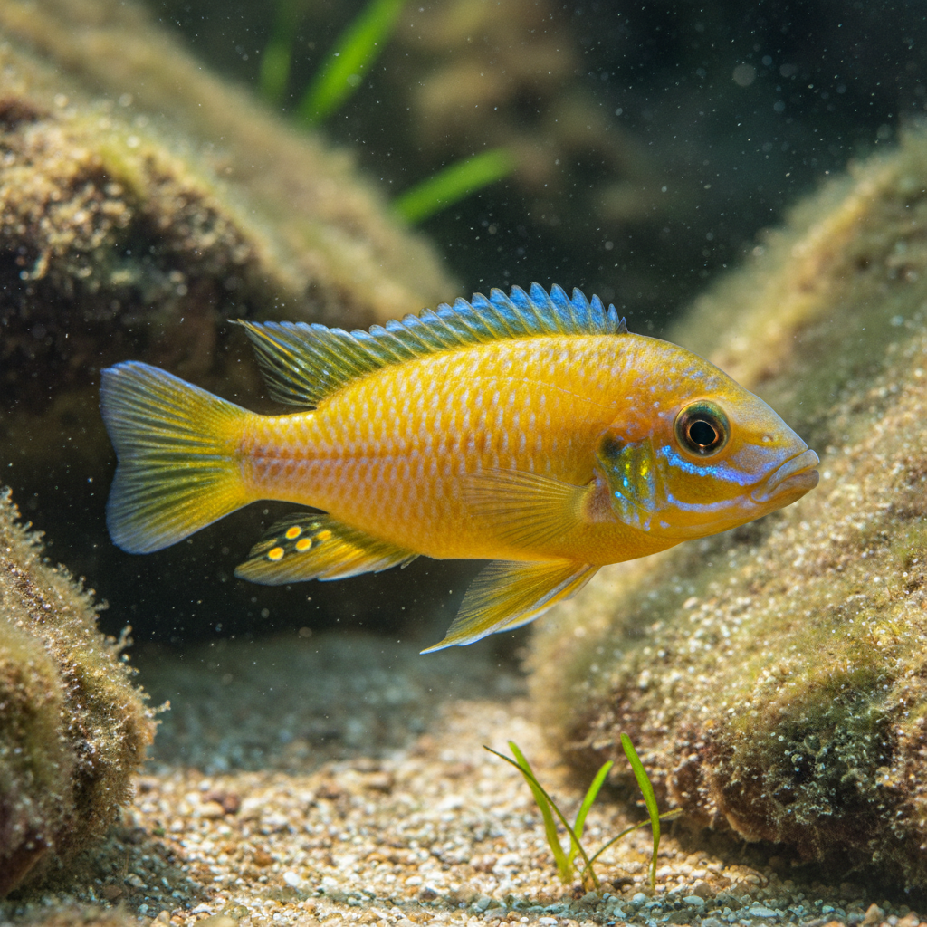 A stunning and regal cichlid from Lake Malawi, the Yellow Peacock is famous for the intense golden coloration of the males and their peaceful, sandy-bottom behavior.