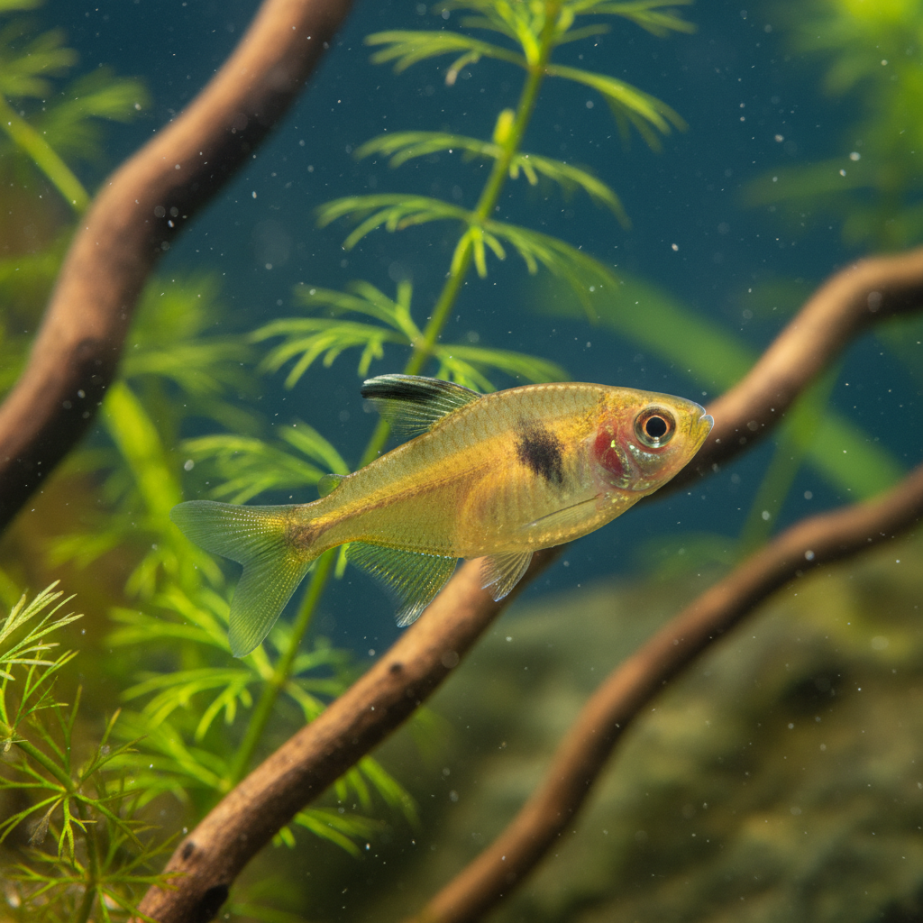 A graceful and subtly colored tetra, the Yellow Phantom is prized for its transparent body, delicate yellow tint, and distinctive dark "phantom" spot.