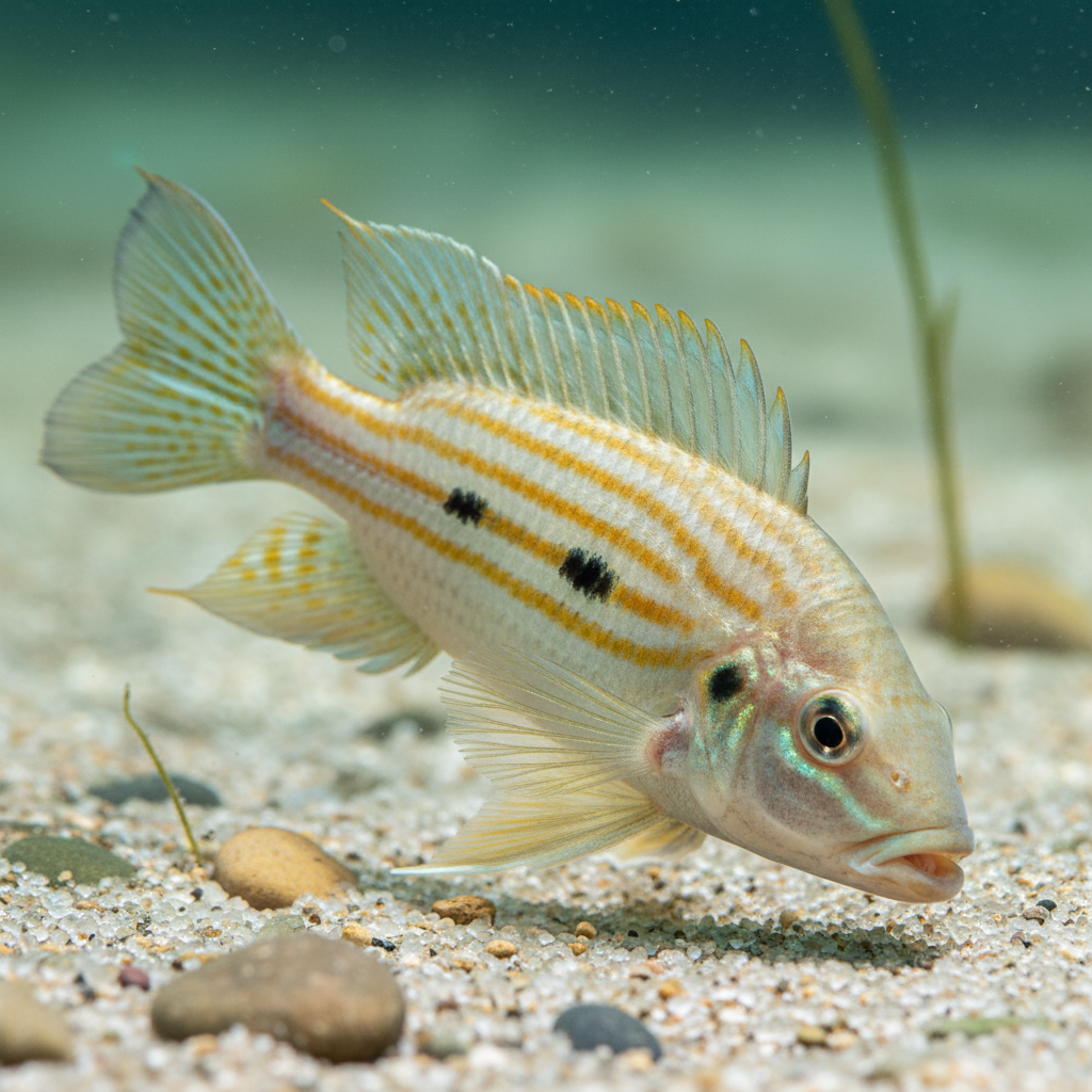 A smaller and highly attractive eartheater, prized for its intricate yellow stripe pattern and its fascinating behavior of sifting through sand.
