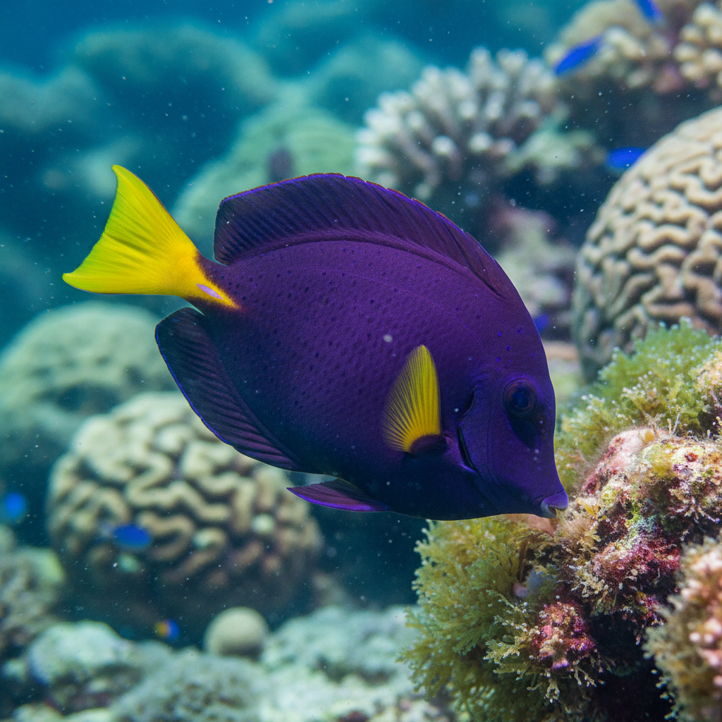 The Yellow Tailed Purple Tang is native to the warm, tropical waters of the Indo-Pacific region, particularly around locales such as the Hawaiian Islands, the Great Barrier Reef, and the waters of Micronesia. This species typically inhabits coral reefs and rocky areas, where they can find both shelter and food. The typical environment includes clear, warm waters where visibility is high, allowing them to graze on the abundant algae that thrive in such conditions. In the wild, these fish tend to occupy depths ranging from 10 to 50 meters, often hiding in crevices or among coral formations.