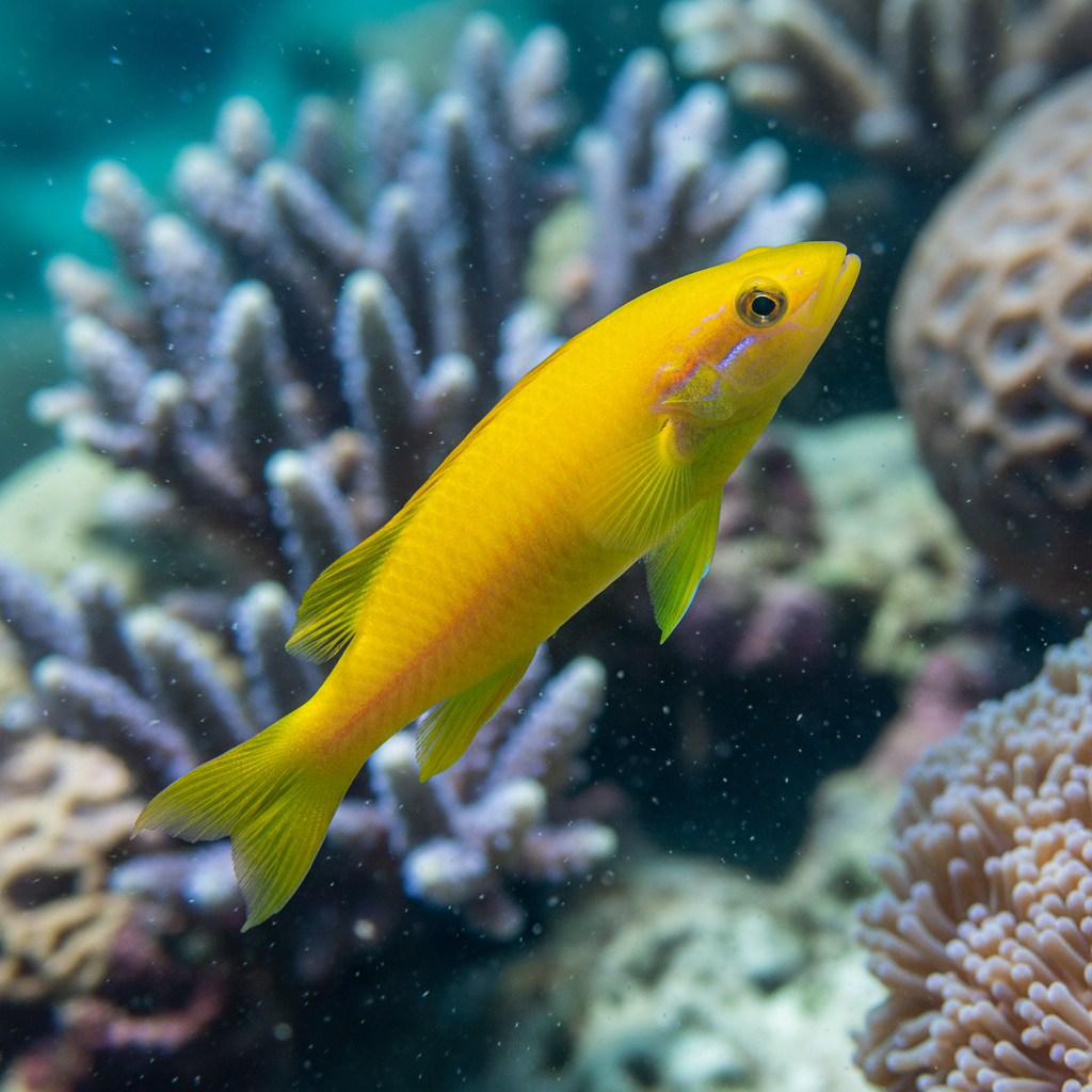 This species favors sandy and rocky substrates, often found hiding in crevices or burrowing into the sand during the day. The natural environment consists of vibrant coral reefs that provide shelter and ample foraging opportunities. These light-rich habitats, characterized by dynamic ecosystems, heavily influence the development of the Yellow Wrasse's vibrant coloration and agile swimming patterns.