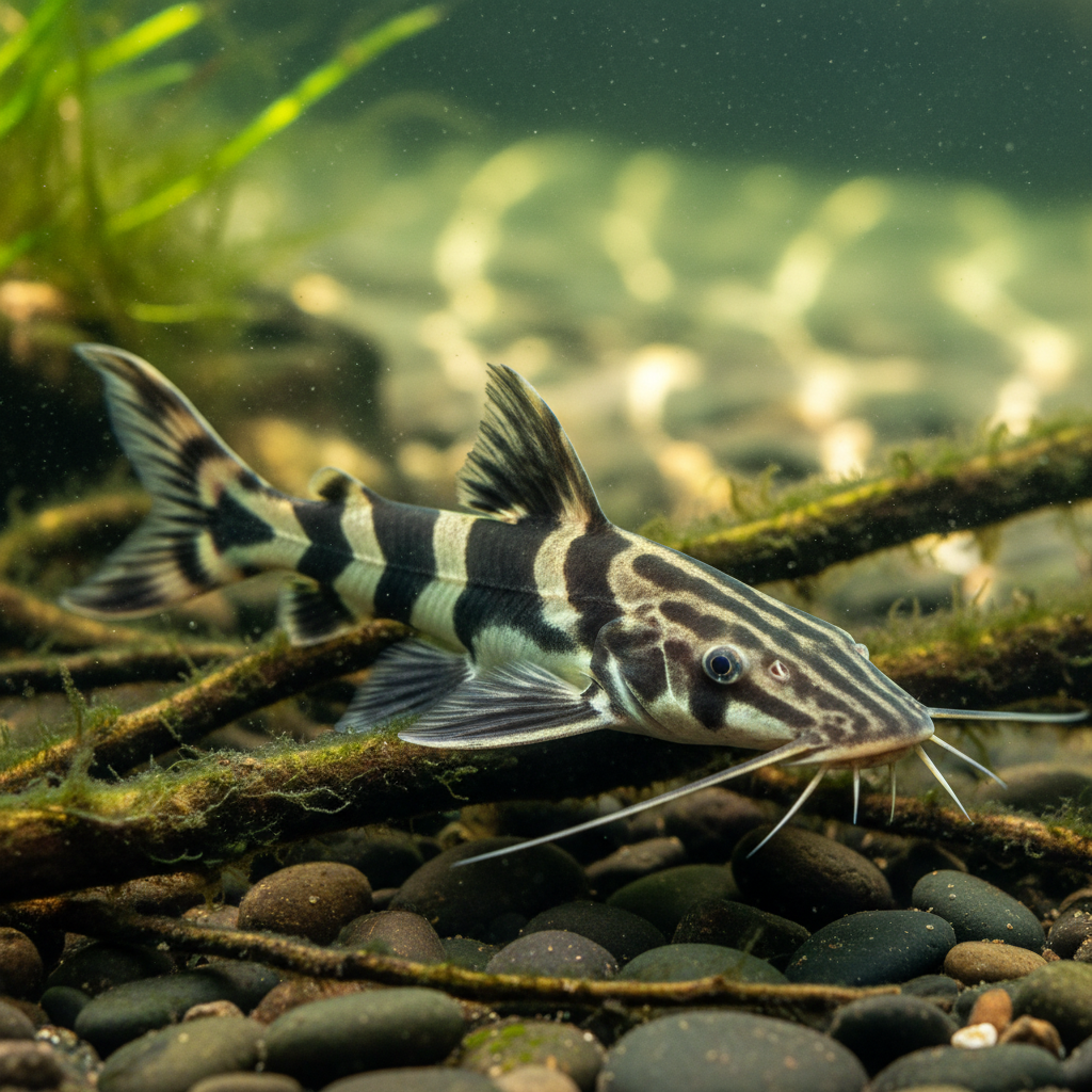 A massive and majestic predatory catfish from the Amazon, prized for its incredibly long whiskers and its stunning black-and-white striped coloration.